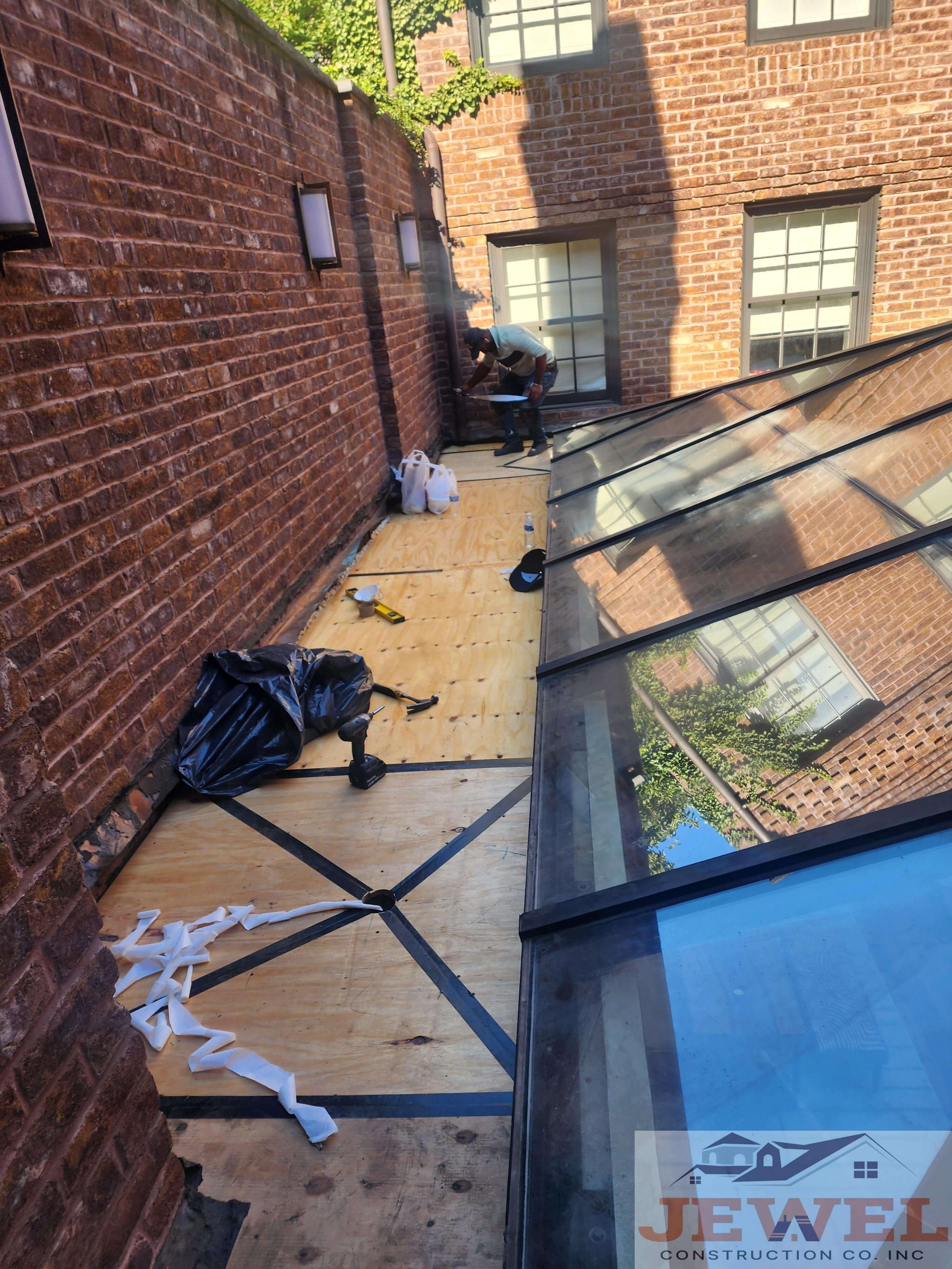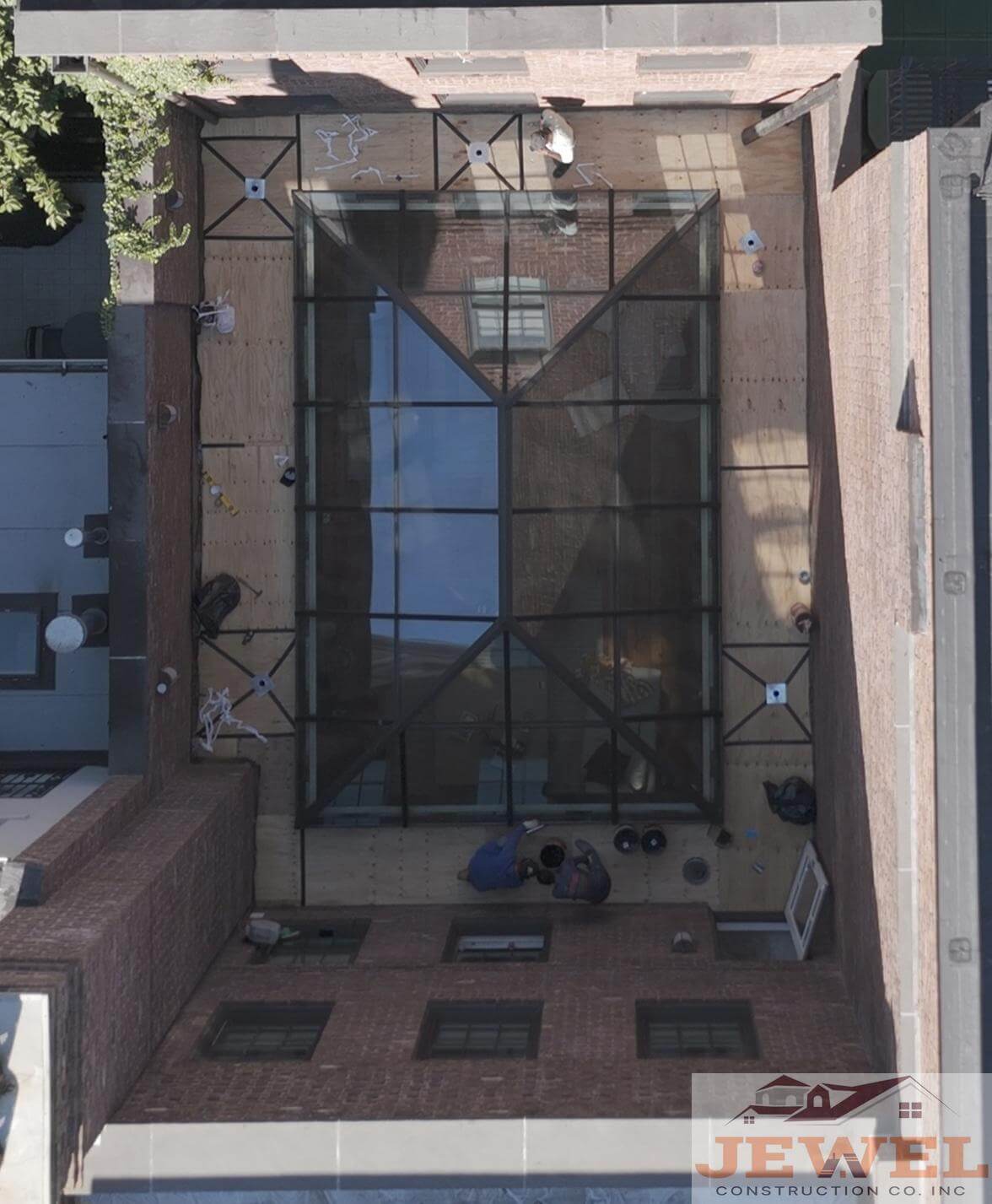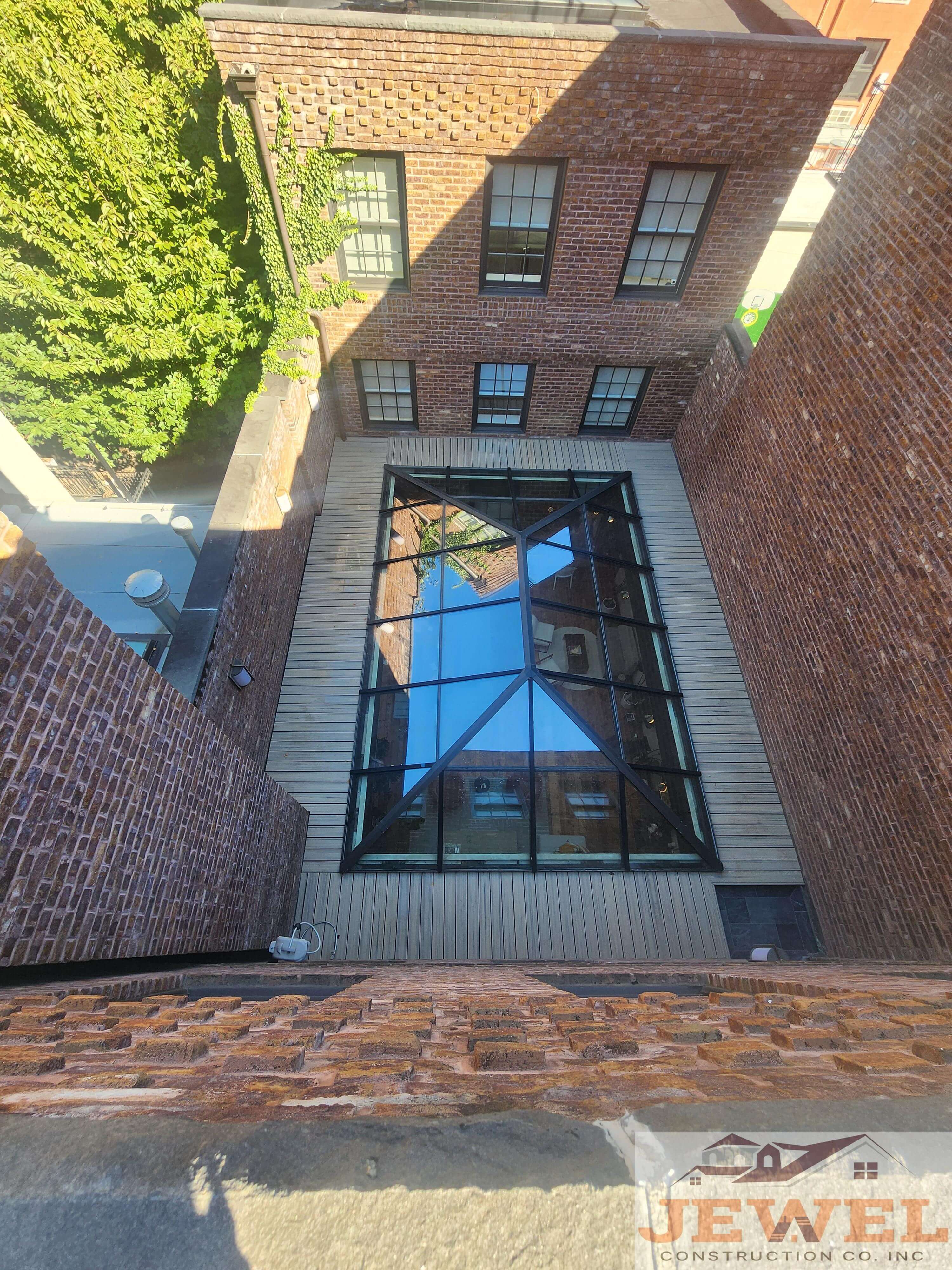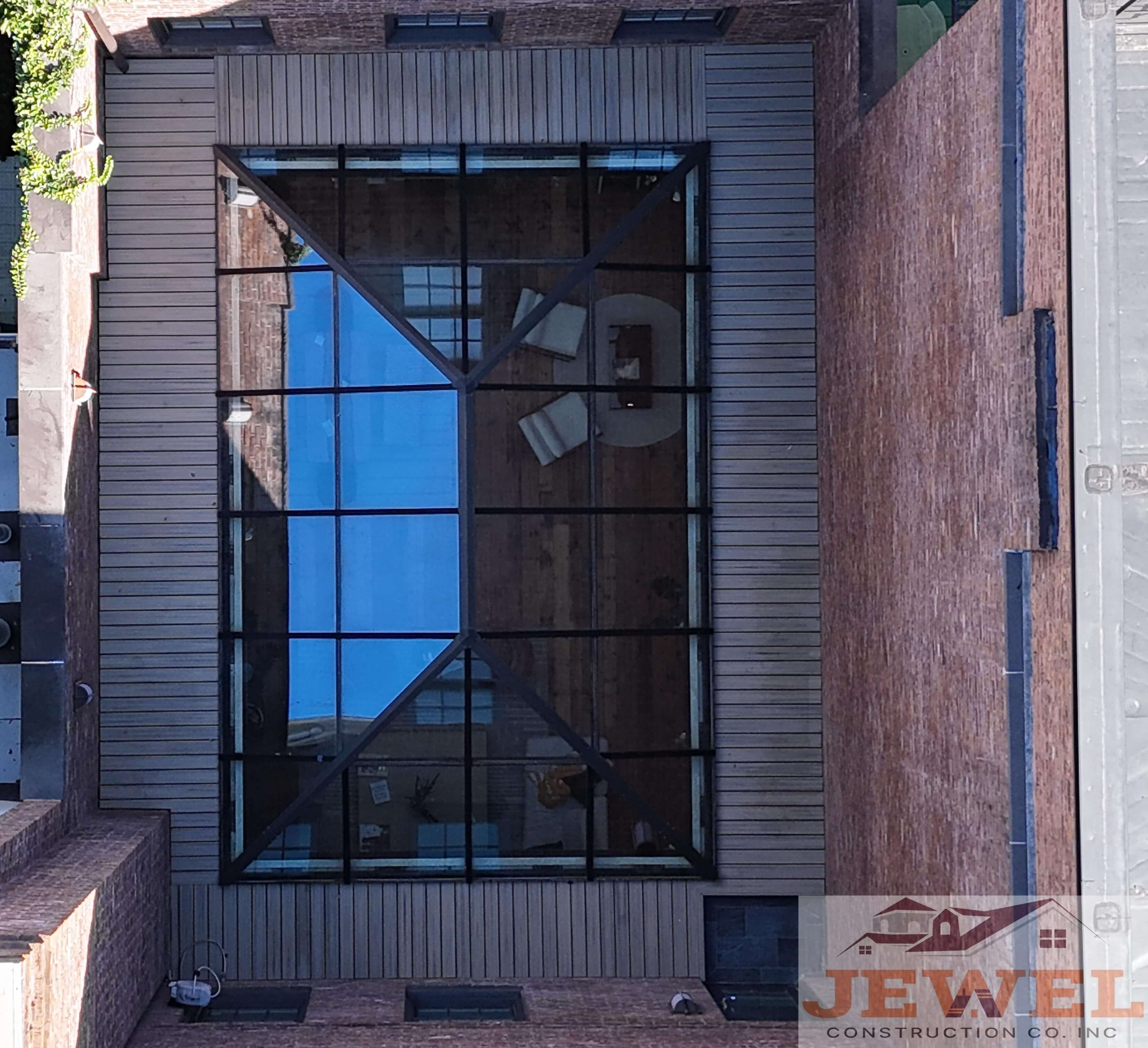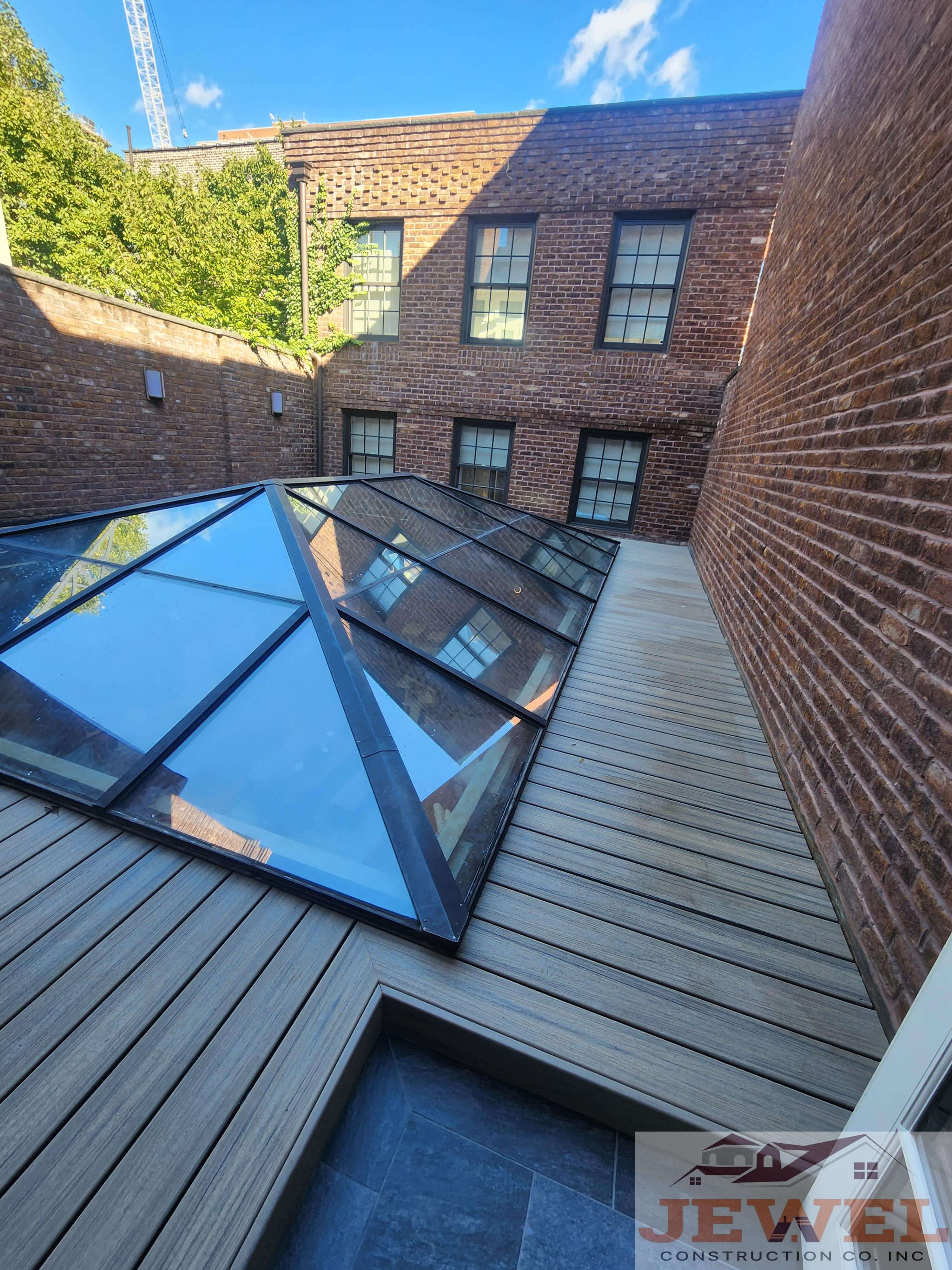 This striking rooftop transformation features premium TREX Honey Grove composite decking in rich espresso tones, anchored by a dramatic steel-framed glass skylight that floods the interior with natural light. The sleek black metal framework creates bold geometric patterns while providing structural support and architectural interest. Horizontal composite decking wraps the perimeter, creating a cohesive modern aesthetic with clean lines. The low-maintenance decking provides durable outdoor living space with stunning city views. Jewel Construction Company's precision engineering—from structural skylight installation to waterproof deck construction—delivers a sophisticated urban retreat. The result is a functional rooftop oasis that maximizes natural light below while creating an elegant entertainment space above.
