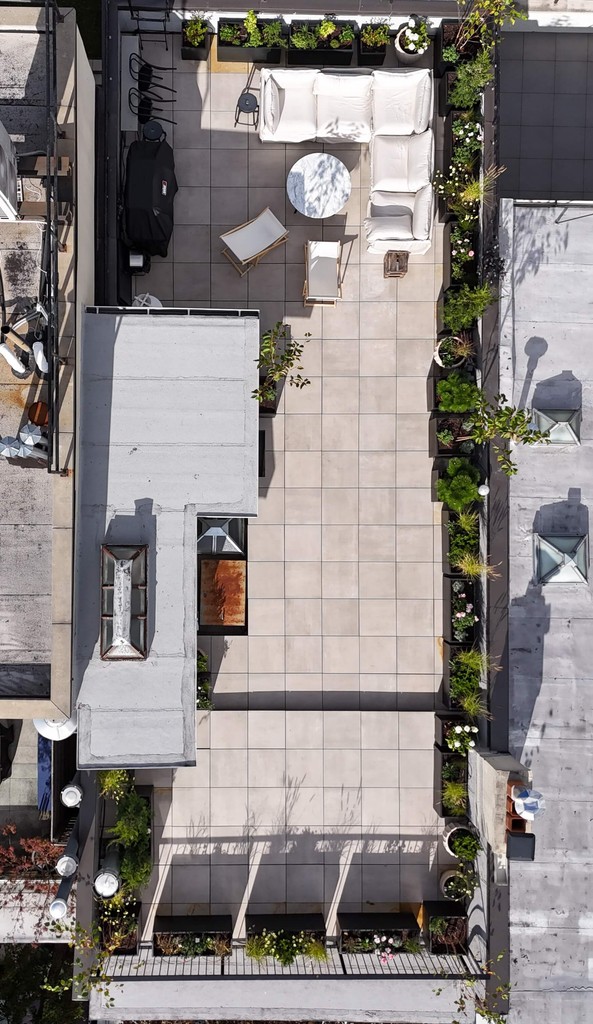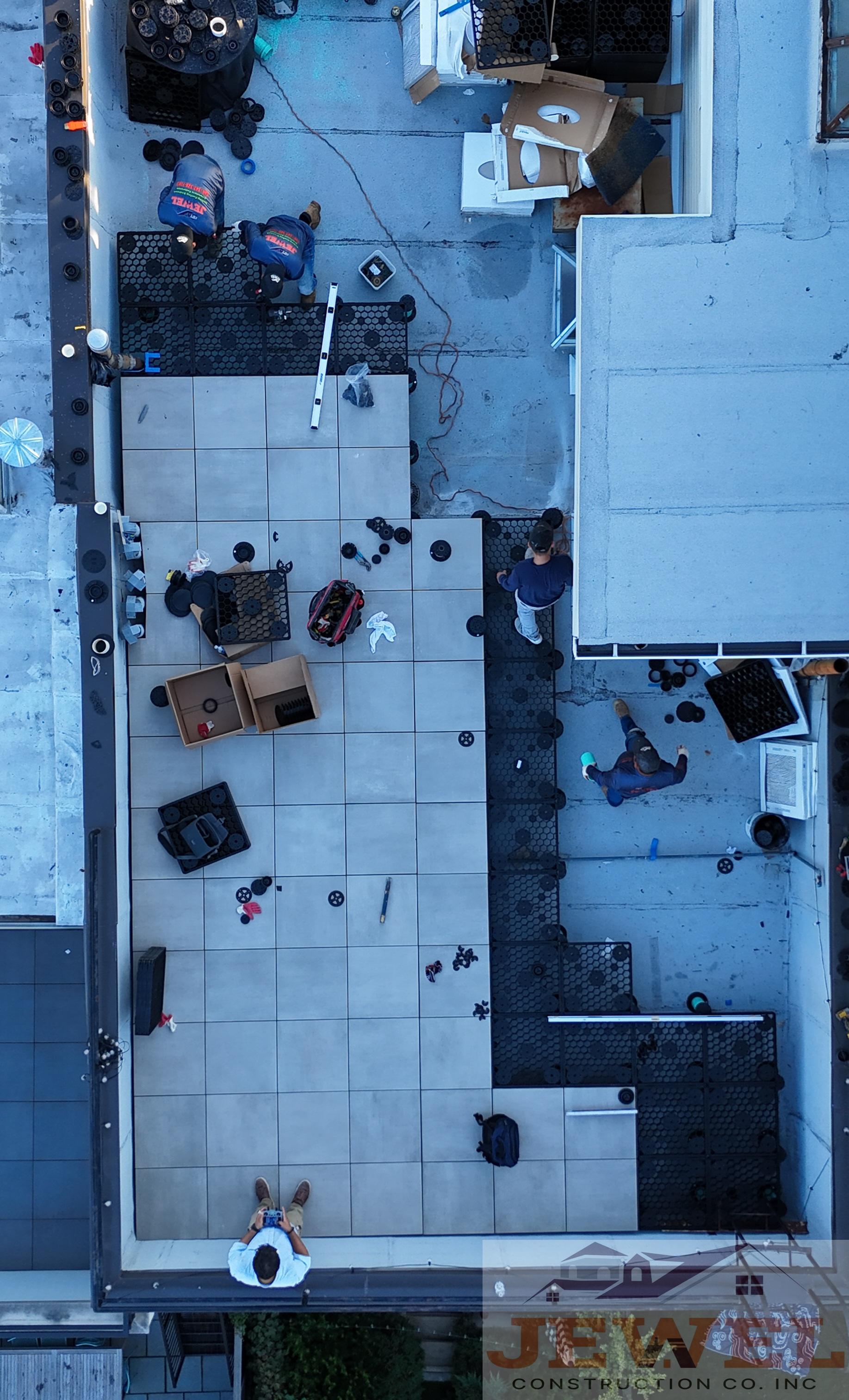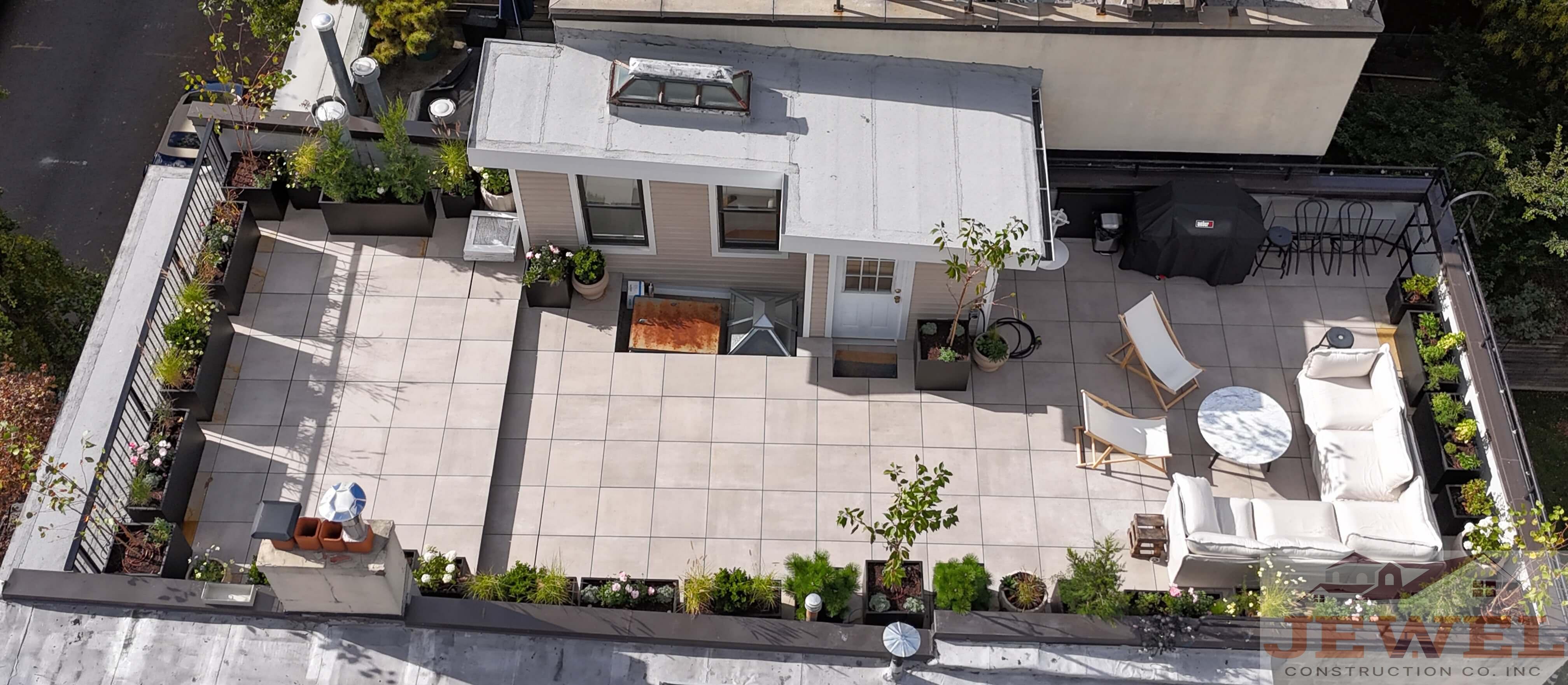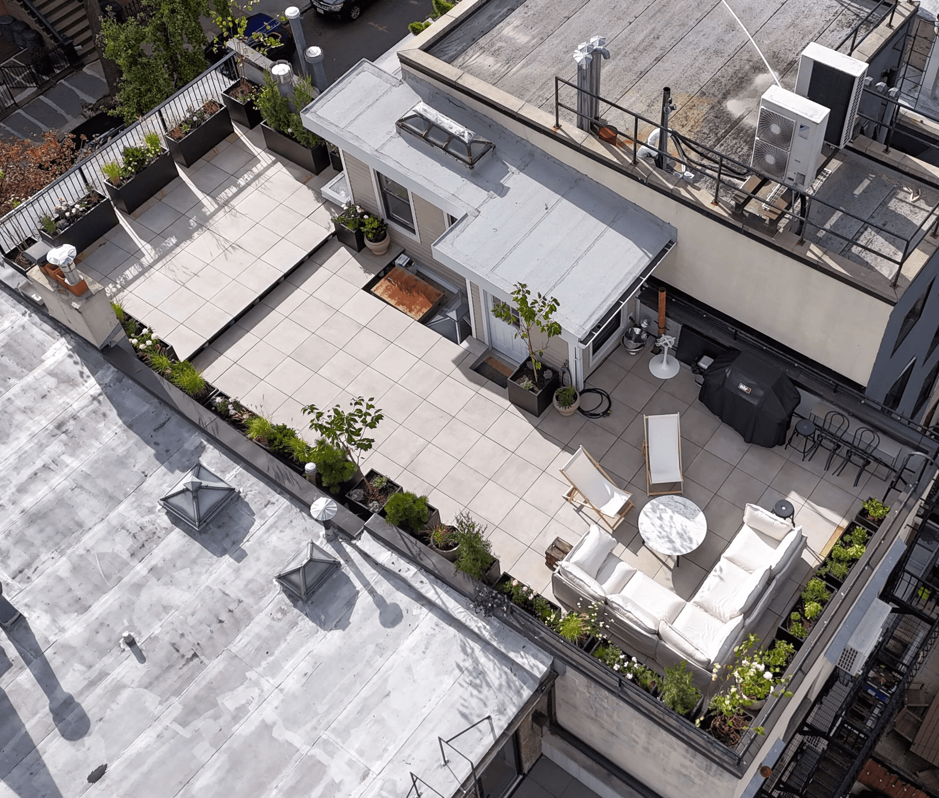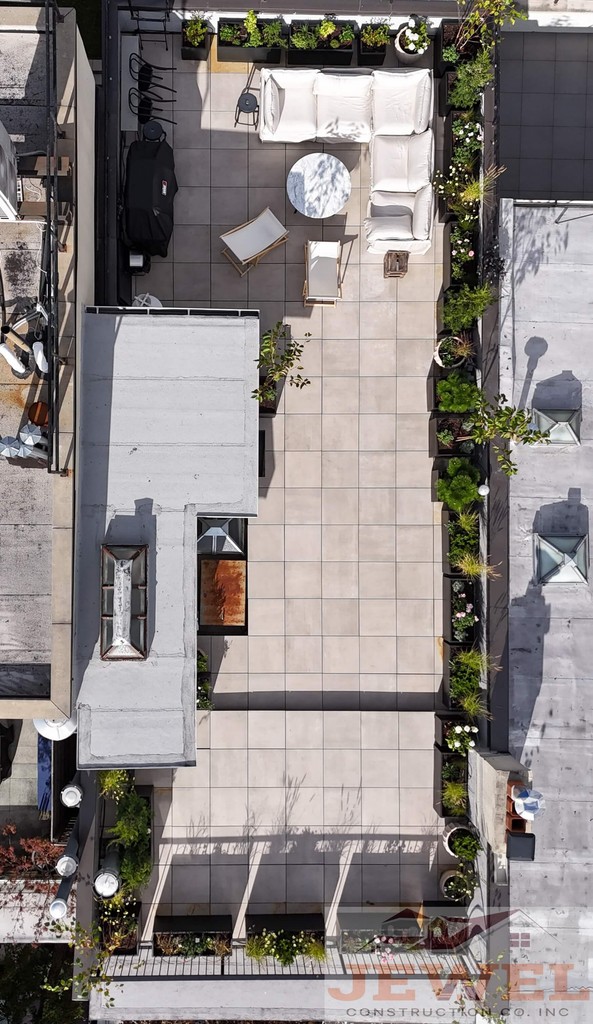 This Rooftop Deck designed with clean lines and a refined layout, the space features large-format TileTech Cenere Cement Porcelain Pavers in a Rustic Maple finish, installed on a hybrid pedestal system with the TileTech HEX Pavers Tray System. Integrated planters and thoughtfully defined zones create dedicated areas for lounging, dining, and entertaining. The perimeter greenery adds privacy and a natural balance to the sleek architectural elements, while the durable materials ensure long-term performance in a demanding rooftop environment. Every detail—from precise paver alignment to efficient use of space around existing roof structures—reflects our commitment to quality craftsmanship and smart design. The result is a functional and elegant rooftop retreat that transforms unused roof space into a comfortable, stylish extension of the home.