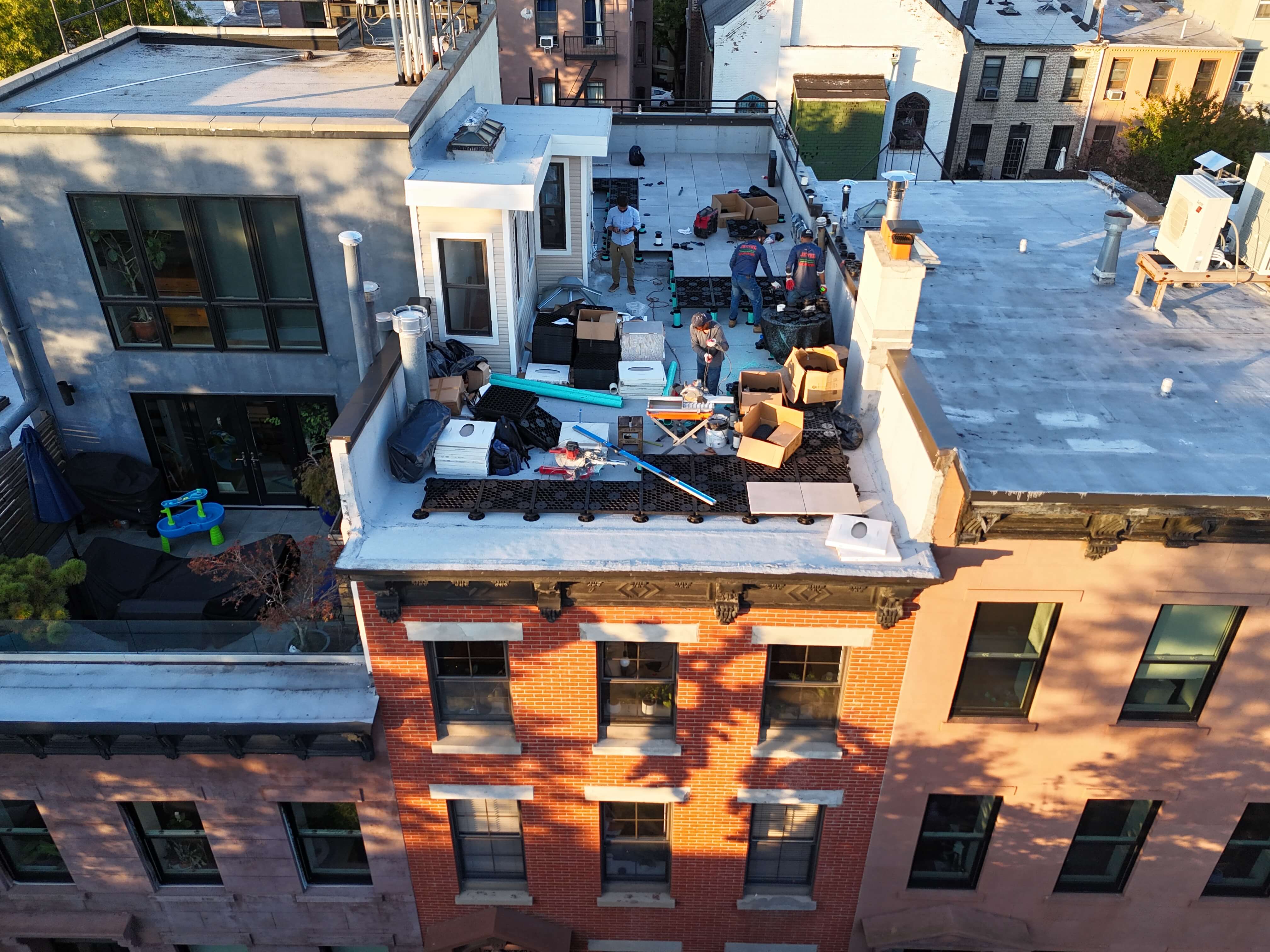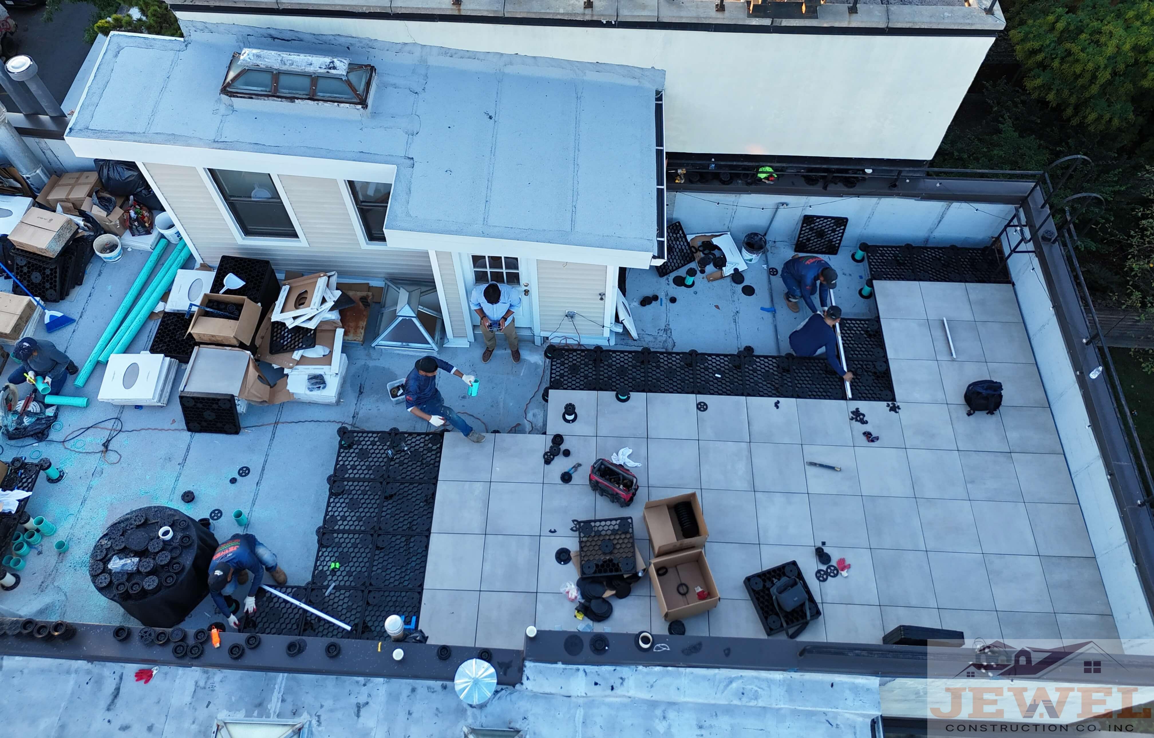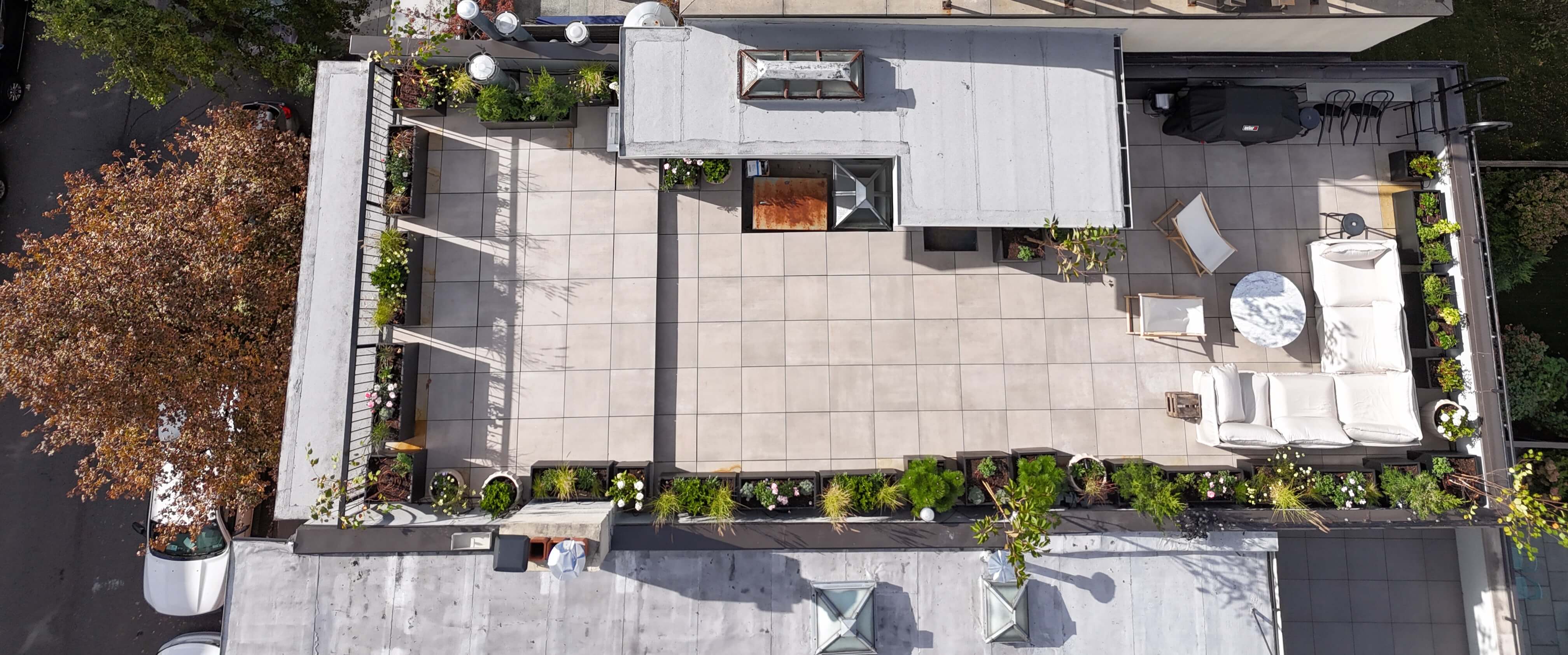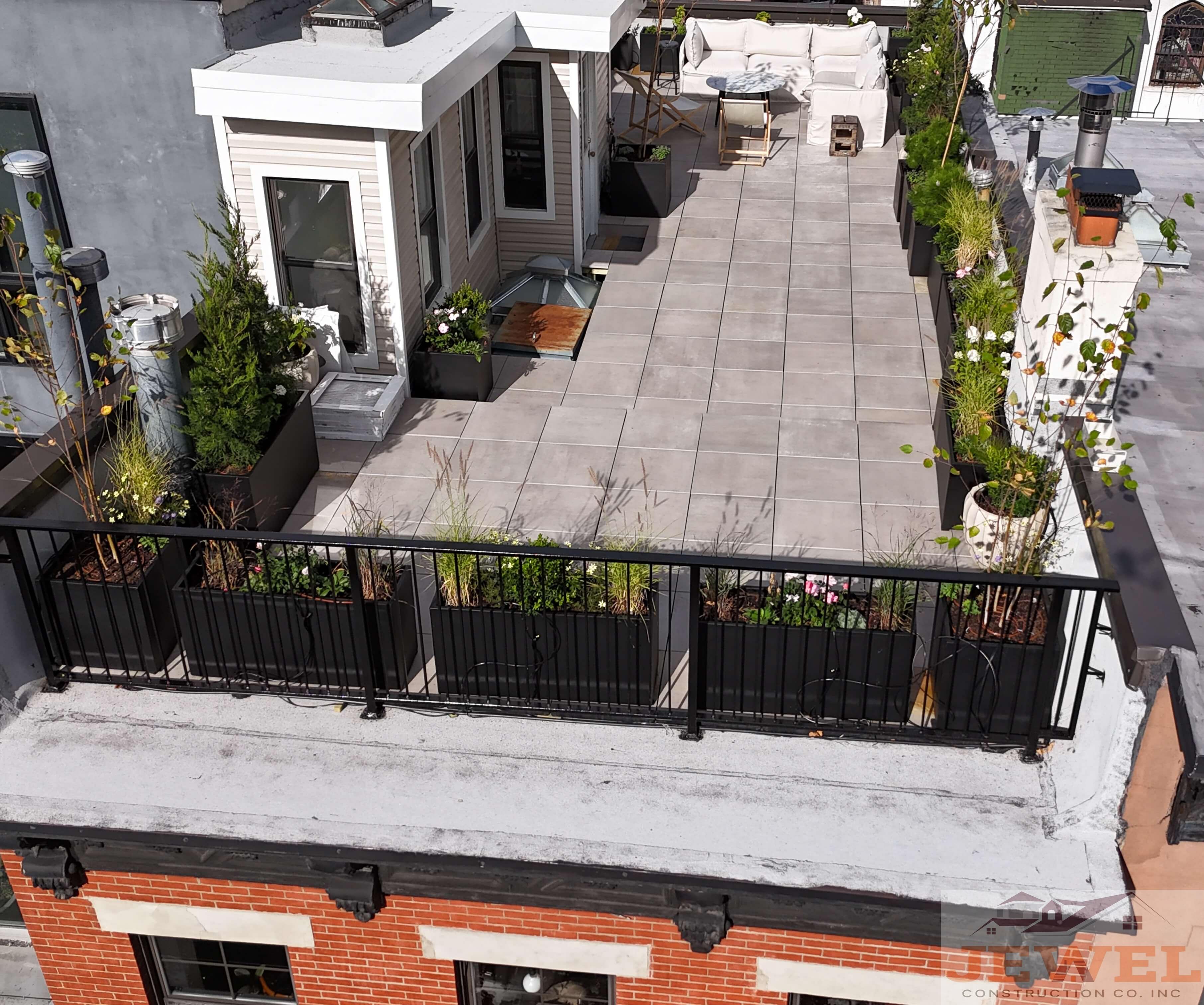 This Rooftop Deck designed with clean lines and a refined layout, the space features large-format TileTech Cenere Cement Porcelain Pavers in a Rustic Maple finish, installed on a hybrid pedestal system with the TileTech HEX Pavers Tray System. Integrated planters and thoughtfully defined zones create dedicated areas for lounging, dining, and entertaining. The perimeter greenery adds privacy and a natural balance to the sleek architectural elements, while the durable materials ensure long-term performance in a demanding rooftop environment. Every detail—from precise paver alignment to efficient use of space around existing roof structures—reflects our commitment to quality craftsmanship and smart design. The result is a functional and elegant rooftop retreat that transforms unused roof space into a comfortable, stylish extension of the home.
